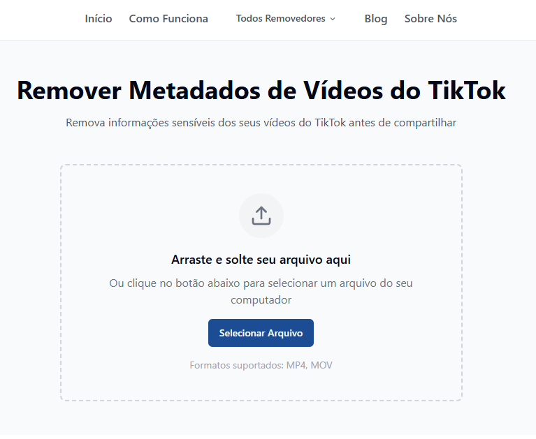 Você pode usar nosso site Metadados Oficial – TikTok para eliminar os dados ocultos dos seus vídeos antes de compartilhá-los. Basta enviar o vídeo, aguardar alguns segundos e baixar o arquivo limpo, pronto para ser compartilhado com segurança.